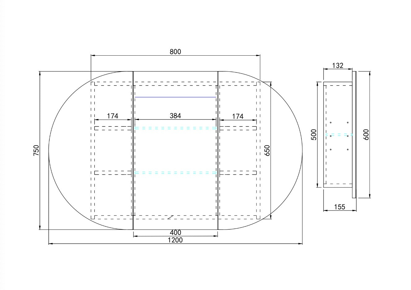 The Olivia minimalist mirror cabinet features an elongated oval shape for a contemporary look