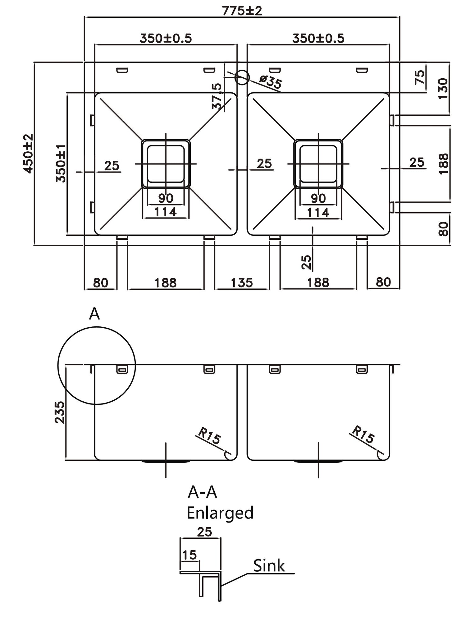 Stainless Steel Double Bowl Sink 775*450*235mm